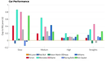 Хотя машины в цветах папайи уступают Ред Буллу, Рейсинг Буллс и Уильямсу в медленных поворотах — согласно нашим данным, — они доминируют на средних и высоких скоростях, а также на прямых.