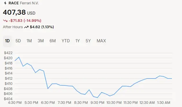 Акции Ferrari пережили одно из самых значительных падений за последние годы — их стоимость рухнула на 15% всего за один день.