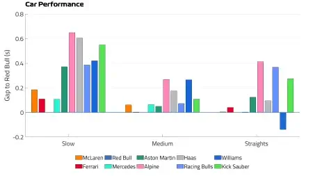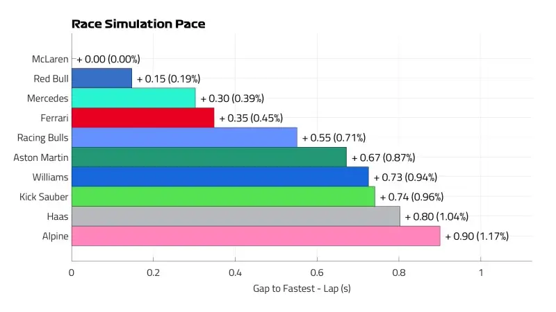 Ferrari провела обнадеживающий день, хотя до победы им, возможно, пока далеко. Шарль Леклер лидировал в первой практике и стал вторым во второй, заявив: "День прошел позитивно, я чувствовал себя комфортно за рулем". Однако он признал, что Ferrari уступает Red Bull на коротких сериях и McLaren на длинных. Данные подтверждают: в квалификационном и гоночном темпе Ferrari отстает примерно на 0,3 секунды, занимая четвертое место в обоих показателях.
