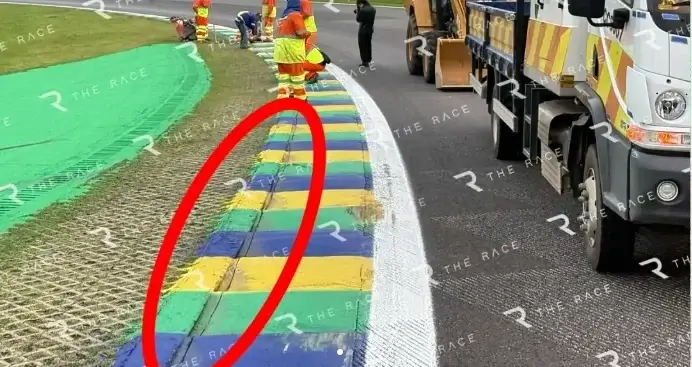 Срочная канавка (отмечена красным овалом) теперь тянется вдоль внешнего края поребрика, отводя воду с трассы на газон за ним. Цель простая: не дать лужам снова скопиться, если дождь вернётся во время воскресного Гран-при.