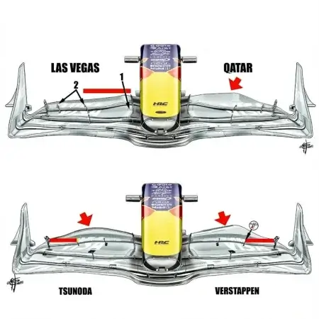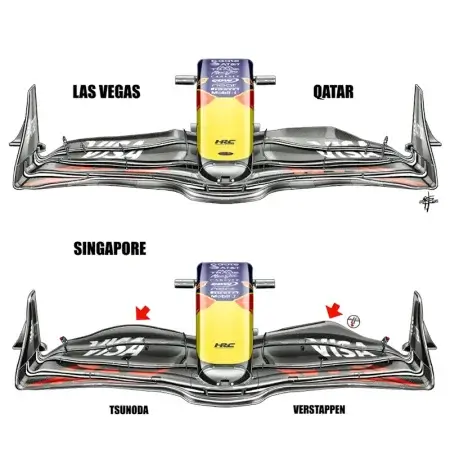 Red Bull Racing не прекращает работу над аэродинамическими решениями своего болида. Команда постоянно экспериментирует с передним антикрылом, внося изменения от гонки к гонке. В Лас-Вегасе и Сингапуре австрийская команда представила новые технические решения, направленные на улучшение гибкости ключевых элементов.
