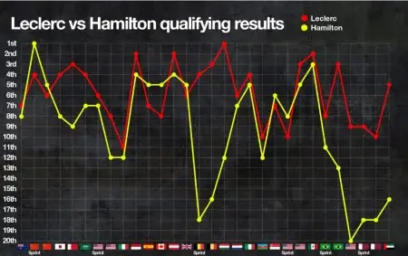 К середине сезона показатели Хэмилтона были на вполне достойном уровне — 86,6% от очков Леклера. Однако спад во второй половине чемпионата оказался драматичным и совпал с общим регрессом формы Ferrari, переставшей привозить эффективные новинки.