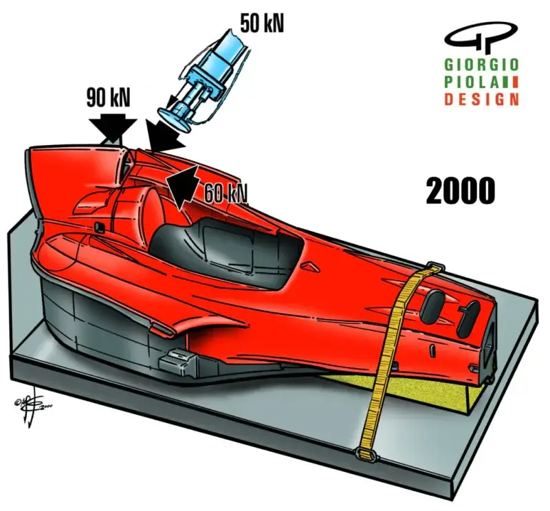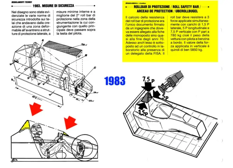 Первые полноценные краш-тесты стартовали в 1983 году — одновременно с введением второй дуги безопасности на уровне панели приборов. Голова гонщика должна была оставаться ниже линии, соединяющей две конструкции. Вертикальная сила при испытании составляла 7,5 массы болида — по тем меркам это было эквивалентно 5850 кг.