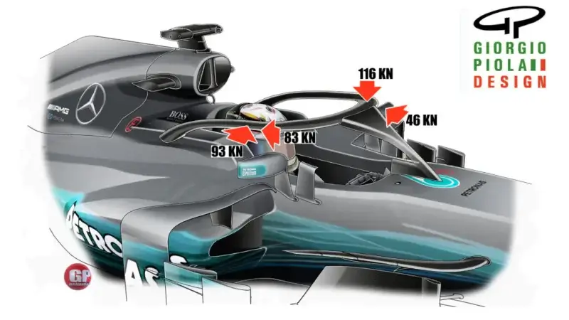 Официально Halo пришёл в 2018 году вместе с крайне жёсткими краш-тестами и дополнительным испытанием, имитирующим удар колеса, летящего со скоростью 225 км/ч. Это титановая конструкция вокруг кокпита, рассчитанная на очень высокие нагрузки и на то, чтобы отводить опасные объекты от головы гонщика. В последние годы Halo не раз сыграл решающую роль, окончательно закрепившись как ключевой элемент защиты в Формуле-1.