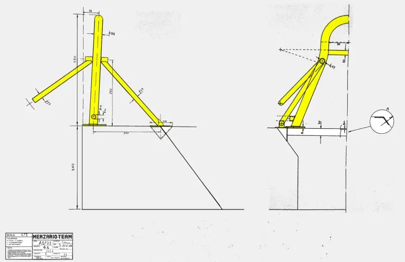 Я, разумеется, сильно сомневался: в моём резюме чертёжника не было ни одного формального курса по техническому черчению — только увлечённость и опыт, во многом накопленный благодаря тому, что я следил за разработкой одного из ориентиров Формулы-1: революционной Ferrari B3 Мауро Форгьери, на которой выступал Мерцарио. Чертёж дуги безопасности стал моей второй работой для A1 — конечно, при поддержке «настоящего» конструктора, инженера Джанни Марелли, который и обеспечил сертификацию, требуемую регламентом.