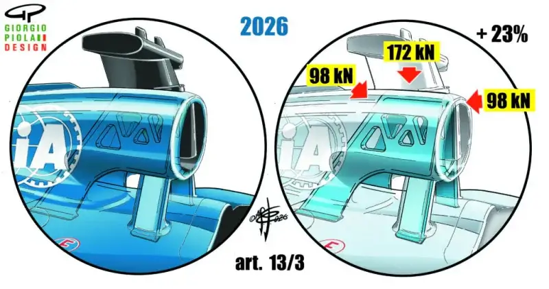 Во-вторых, заметно ужесточены требования к узлу основной дуги безопасности. Пока болиды 2026 года существуют в основном на фотографиях и рендерах раскрасок, самое время оценить, как выросли требования к структурам, которые защищают голову гонщика. Нагрузки, прикладываемые к дуге безопасности, увеличены со 140 кН в прошлом сезоне до 172 кН для болидов 2026 года. А если сравнить с испытаниями образца 2000 года, прогресс выглядит ещё нагляднее: величина вертикальной нагрузки почти удвоилась.