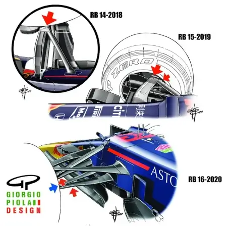 Привычный верхний треугольный рычаг уступил место многорычажной схеме (multilink). Это решение напрямую отсылает нас к конструкции RB15 образца 2019 года, где разделение рычагов позволяло гибко управлять кинематикой подвески и создавать виртуальную ось поворота. Кроме того, серьезным изменениям подверглось рулевое управление: рулевая рейка была смещена глубже назад, повторяя компоновку чемпионского болида RB16 сезона 2020 года.