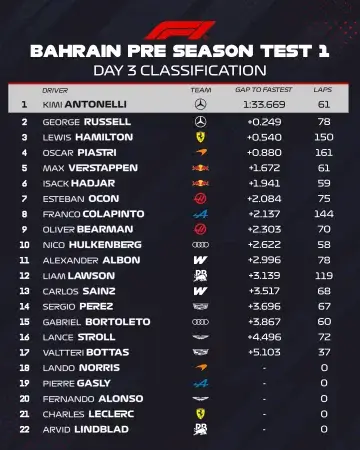Пятничные заезды в Бахрейне завершились триумфом Mercedes: гонщики немецкого коллектива заняли две первые строчки итогового протокола. Кими Антонелли опередил своего напарника Джорджа Расселла, когда команда закрепила за собой лидерство в третий, заключительный день первой серии предсезонных тестов.