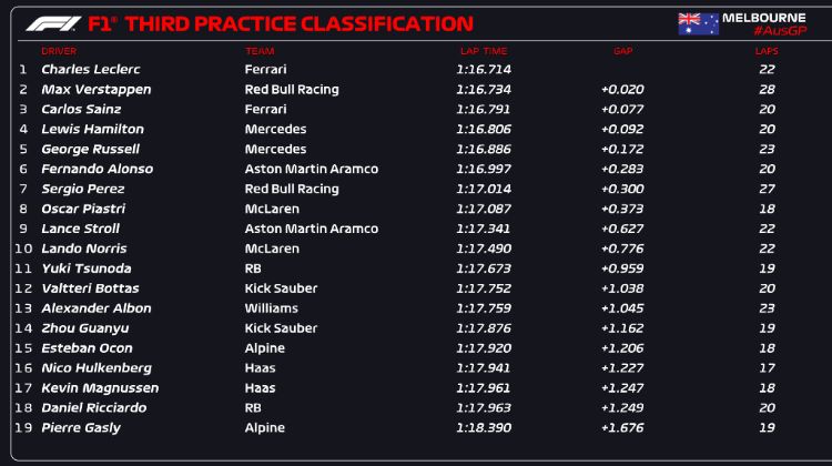 Фернандо Алонсо финишировал на шестом месте, за ним следовал другой гонщик Red Bull, Серхио Перес, в то время как Оскар Пиастри стал самым быстрым из австралийских гонщиков, заняв восьмое место за рулем McLaren и его отставание от лидера Леклера составило всего 0,373 секунды на фоне крайне малых различий во времени.